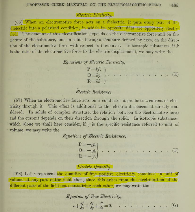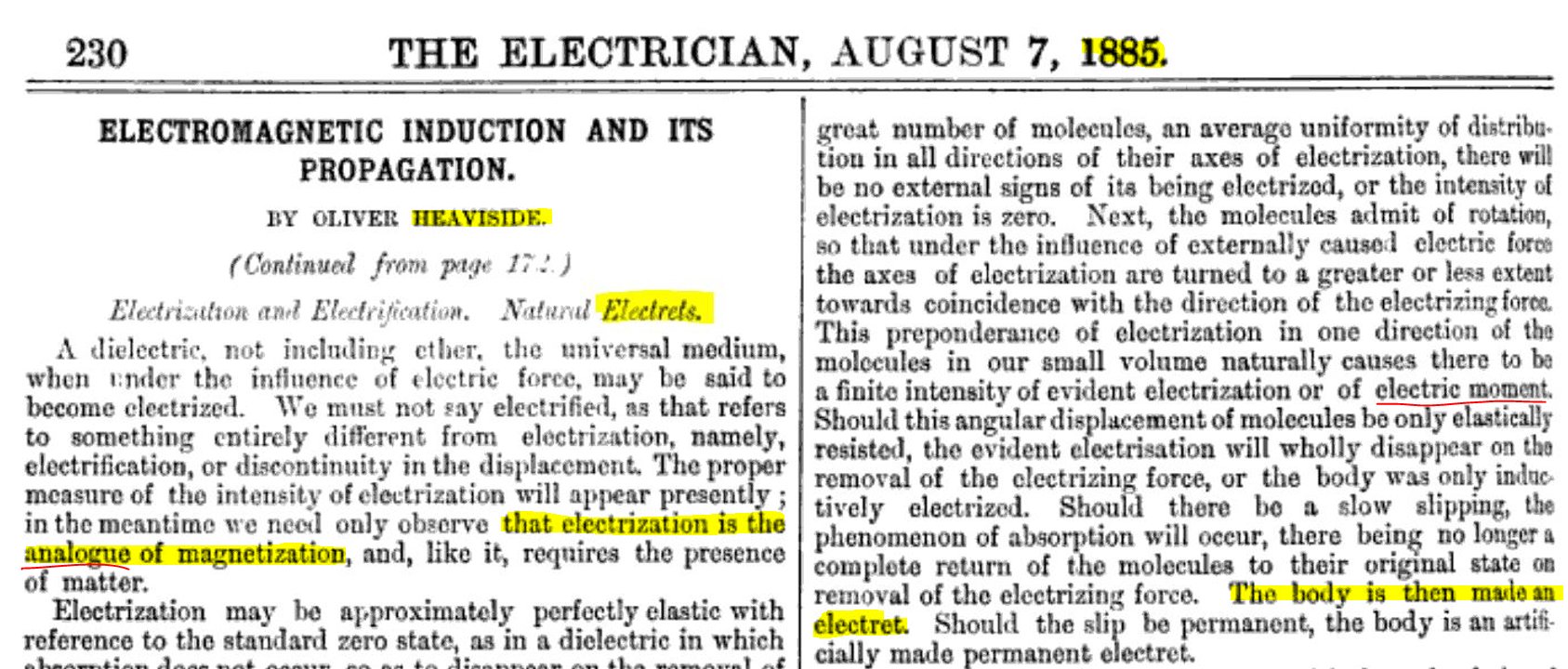 And this Maxwellian mechanism is used in modern zero-point energy discussions (e.g., Hal Puthoff): polarizable vacuum Heaviside coined "electret" in 1885: the dielectric analog of a magnet, i.e. a temporarily polarized insulator. Deeper Dive: Recommended Video